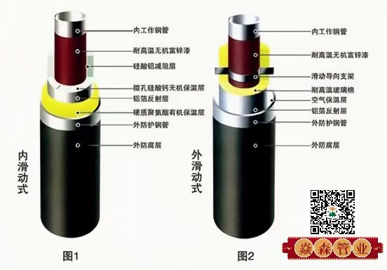 1內(nèi)滑動式:保溫結(jié)構(gòu)由工作鋼管、硅酸鋁、減阻層、微孔硅酸鈣、隔熱層、不銹鋼緊固鋼帶、鋁箔反射層、聚氨酯保溫層、外套鋼管、外防腐層組成。