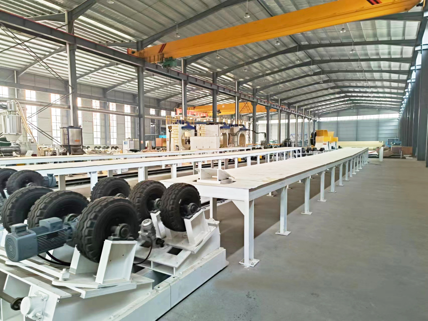 在噴涂區(qū),噴槍不動,鋼管在一定角度的旋轉(zhuǎn)拖船上以恒定的速度行進,并且噴槍將聚氨酯原料均勻地噴灑在螺旋鋼管上,并在其中形成聚氨酯泡沫在一定時間內(nèi)完成絕緣層的生產(chǎn),等待聚氨酯泡沫體固化后,傳送到纏繞區(qū)。